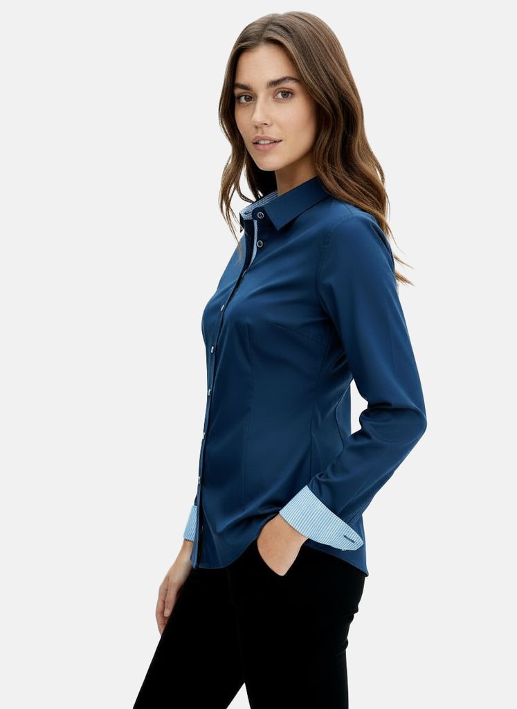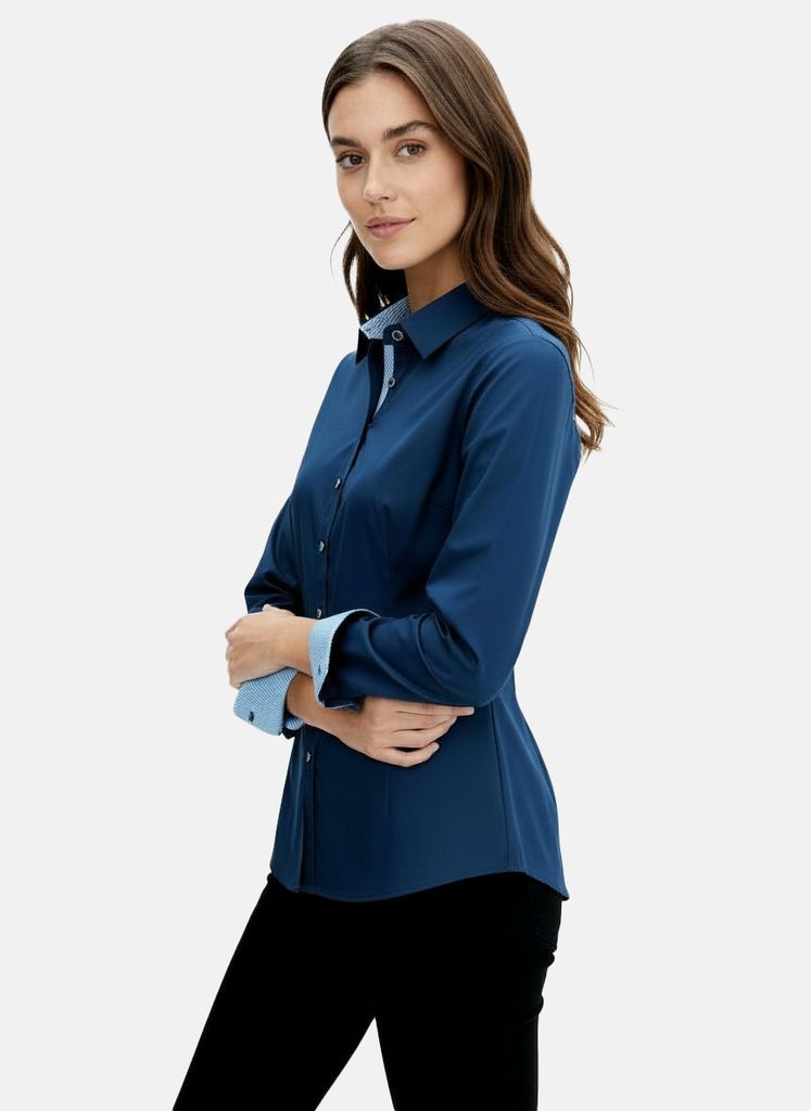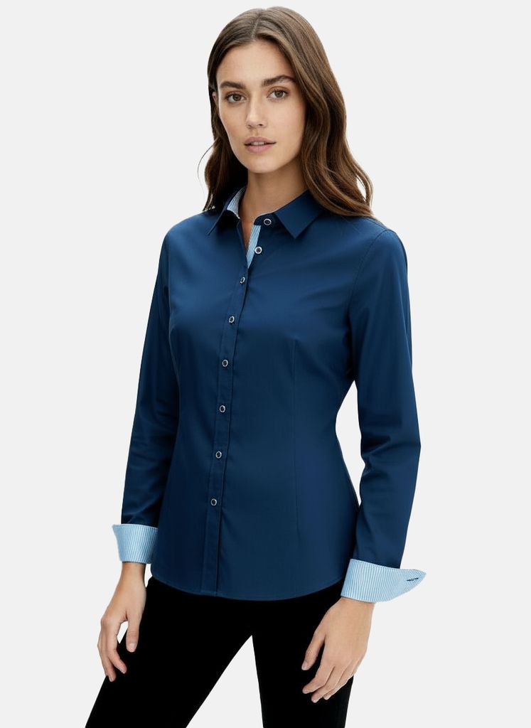 Diese edle Damenbluse von Heventon vereint klassisches Design mit modernem Chic. Das dunkelblaue Modell überzeugt durch seine klare Linienführung und eine leicht taillierte Slim-Fit-Passform, die die feminine Silhouette dezent betont. Der hochwertige Baumwoll-Mix sorgt für ein angenehmes Tragegefühl und eine glatte, gepflegte Optik – perfekt für Büro, Alltag oder elegante Freizeitlooks.