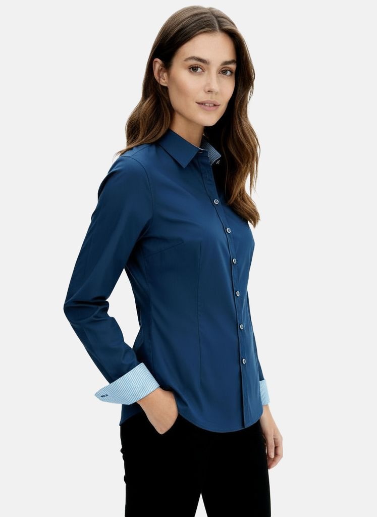Besonderes Highlight sind die Kontrastdetails an Kragen und Manschetten in einem feinen hellblauen Streifenmuster, die der Bluse einen stilvollen Akzent verleihen. Ob geschlossen getragen unter einem Blazer oder lässig mit leicht aufgekrämpelten Ärmeln – diese Bluse passt sich jedem Look mühelos an.